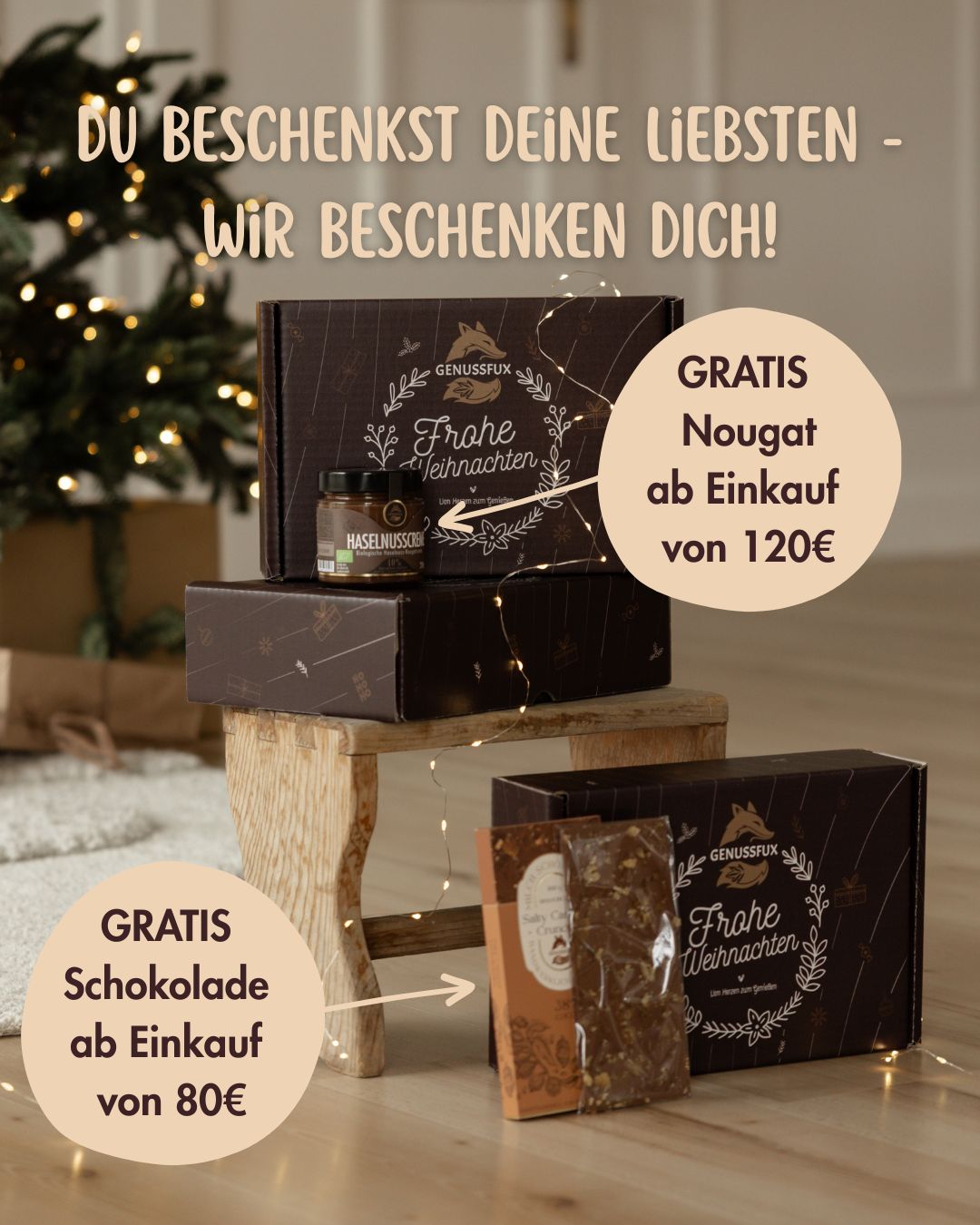 Dieser edle Geschenkkarton im weihnachtlichen Design ist ein perfektes Dankschön für deine Liebsten. Wir befüllen es für dich mit folgenden Genussfux-Klassikern:
